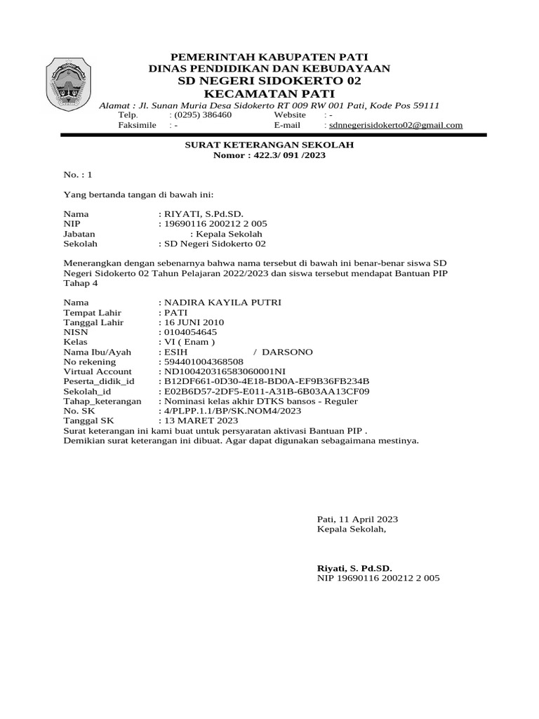 Negeri Sidokerto 02 Tahun Pelajaran 2022/2023 dan siswa tersebut mendapat Bantuan PIP