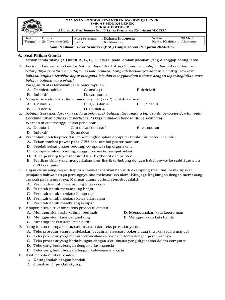 Soal Penilaian Akhir Semester (PAS) Ganjil Tahun Pelajaran 2024/2025
