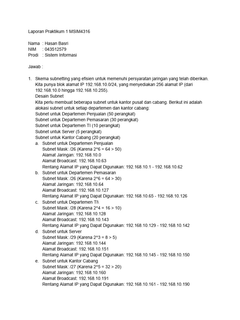 1. Skema subnetting yang efisien untuk memenuhi persyaratan jaringan yang telah diberikan.