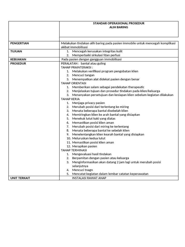 PENGERTIAN Melakukan tindakan alih baring pada pasien immobile untuk mencegah komplikasi