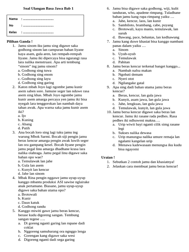 Pilihan Ganda ! 7. Jamu kang duwe khasiat bisa kanggo nambani