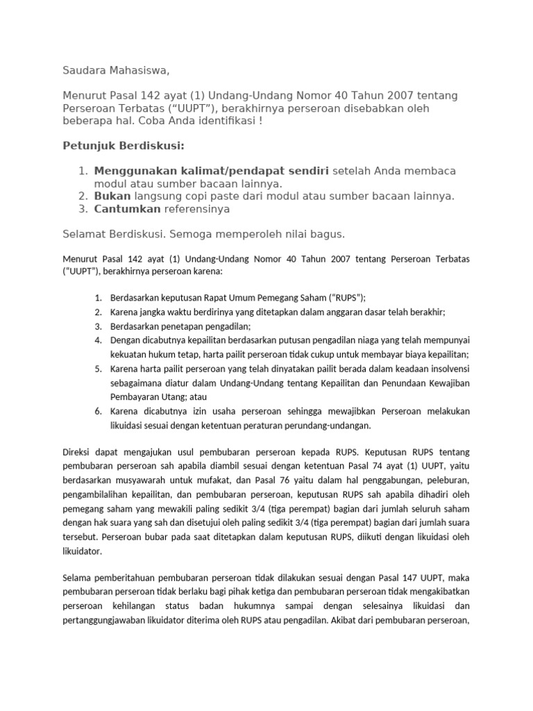 Menurut Pasal 142 ayat (1) Undang-Undang Nomor 40 Tahun 2007 tentang