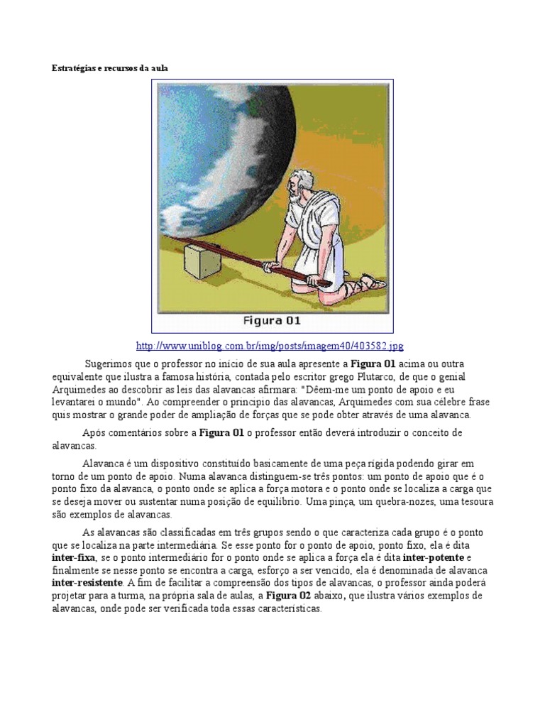 http://www.uniblog.com.br/img/posts/imagem40/403582.jpg Sugerimos que o professor no incio de sua aula apresente a Figura 01 acima ou outra equivalente que ilustra a famosa histria, contada pelo escritor grego Plutarco, de que o genial Arquimedes ao descobrir as leis das alavancas afirmara: "Dem-me um ponto de apoio e eu levantarei o mundo". Ao compreender o principio das alavancas, Arquimedes com sua clebre frase quis mostrar o grande poder de ampliao de foras que se pode obter atravs de uma alavanca. Aps comentrios sobre a Figura 01 o professor ento dever introduzir o conceito de alavancas. Alavanca um dispositivo constitudo basicamente de uma pea rgida podendo girar em torno de um ponto de apoio. Numa alavanca distinguem-se trs pontos: um ponto de apoio que o ponto fixo da alavanca, o ponto onde se aplica a fora motora e o ponto onde se localiza a carga que se deseja mover ou sustentar numa posio de equilbrio. Uma pina, um quebra-nozes, uma tesoura so exemplos de alavancas. As alavancas so classificadas em trs grupos sendo o que caracteriza cada grupo o ponto que se localiza na parte intermediria. Se esse ponto for o ponto de apoio, ponto fixo, ela dita inter-fixa, se o ponto intermedirio for o ponto onde se aplica a fora ela dita inter-potente e finalmente se nesse ponto se encontra a carga, esforo a ser vencido, ela denominada de alavanca inter-resistente. A fim de facilitar a compreenso dos tipos de alavancas, o professor ainda poder projetar para a turma, na prpria sala de aulas, a Figura 02 abaixo, que ilustra vrios exemplos de alavancas, onde pode ser verificada toda essas caractersticas.