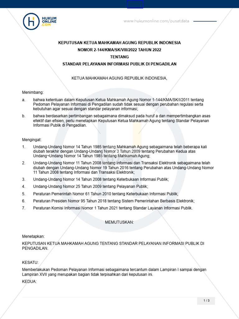 1. Keputusan Ketua Mahkamah Agung Nomor 1- 144/KMA/SK/I/2011 tentang Pedoman Pelayanan Informasi