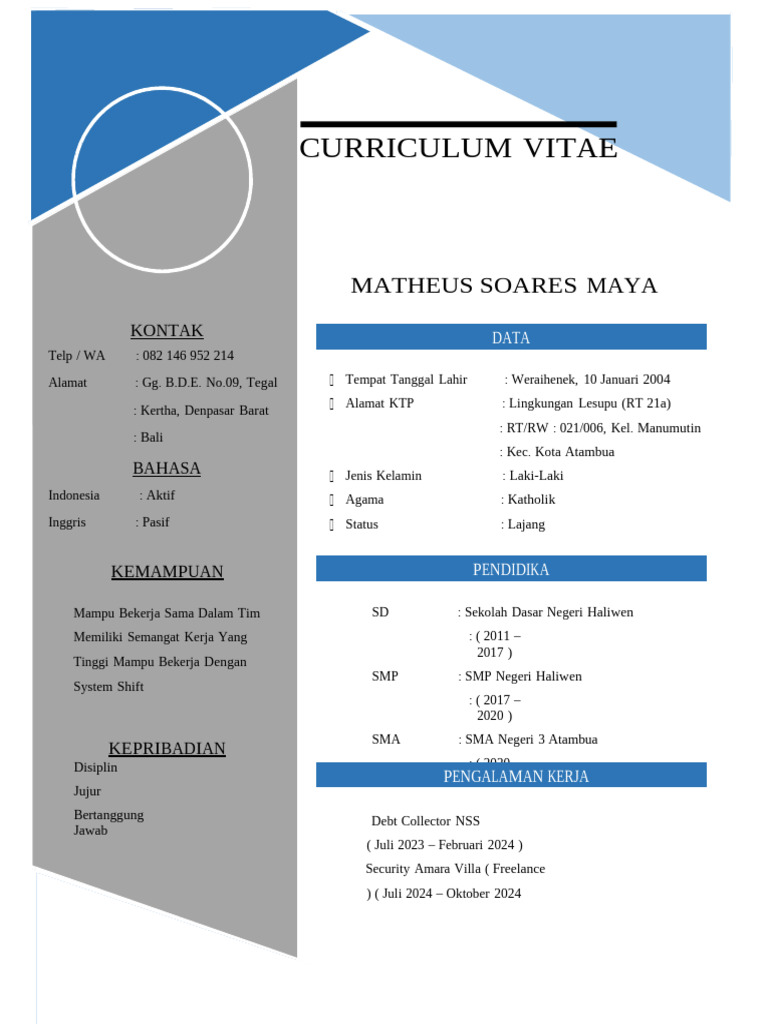 Alamat : Gg. B.D.E. No.09, Tegal Tempat Tanggal Lahir : Weraihenek, 10 Januari 2004