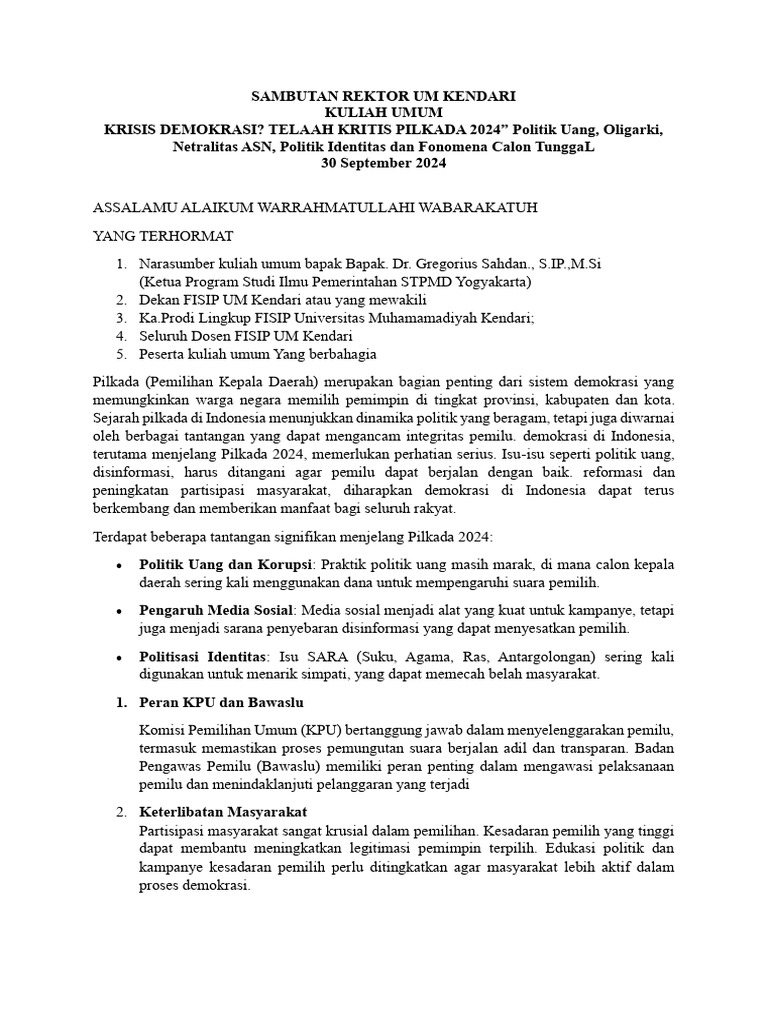 KRISIS DEMOKRASI? TELAAH KRITIS PILKADA 2024” Politik Uang, Oligarki,