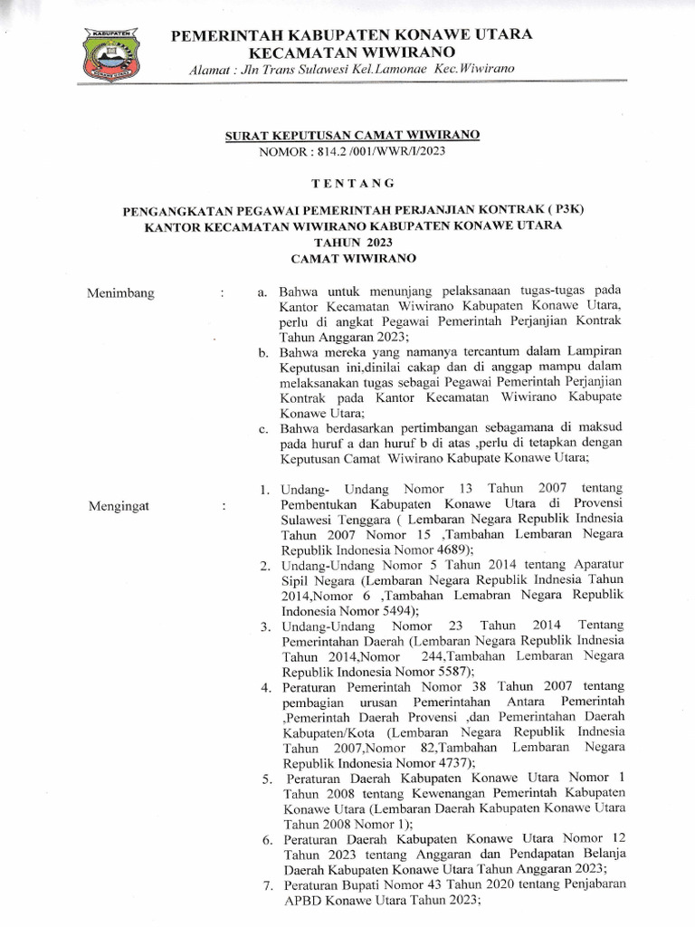 KANTOR I(ECAMATAN WIWIRANO KABUPATEN KONAWE UTARA
