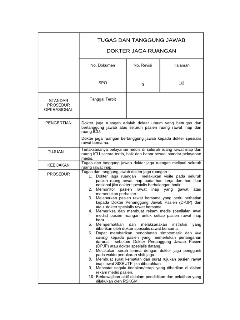 PENGERTIAN Dokter jaga ruangan adalah dokter umum yang bertugas dan