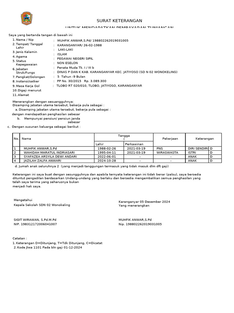 d. Jumah anak seluruhnya 2 (yang menjadi tanggungan termasuk yang tidak masuk dlm dft gaji)