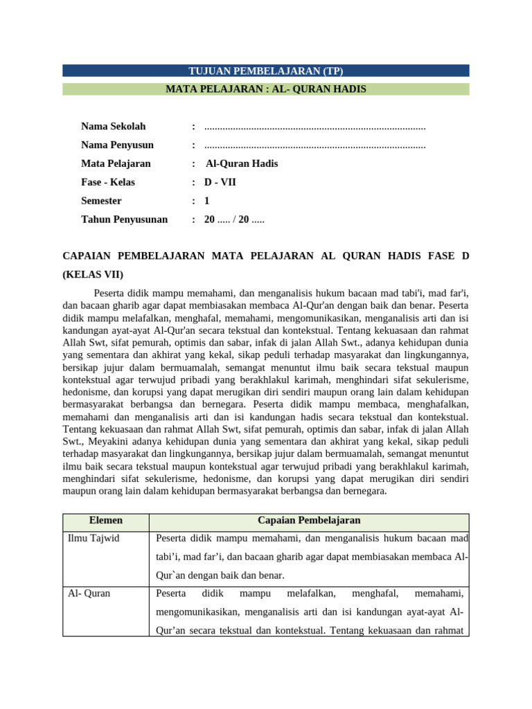 CAPAIAN PEMBELAJARAN MATA PELAJARAN AL QURAN HADIS FASE D
