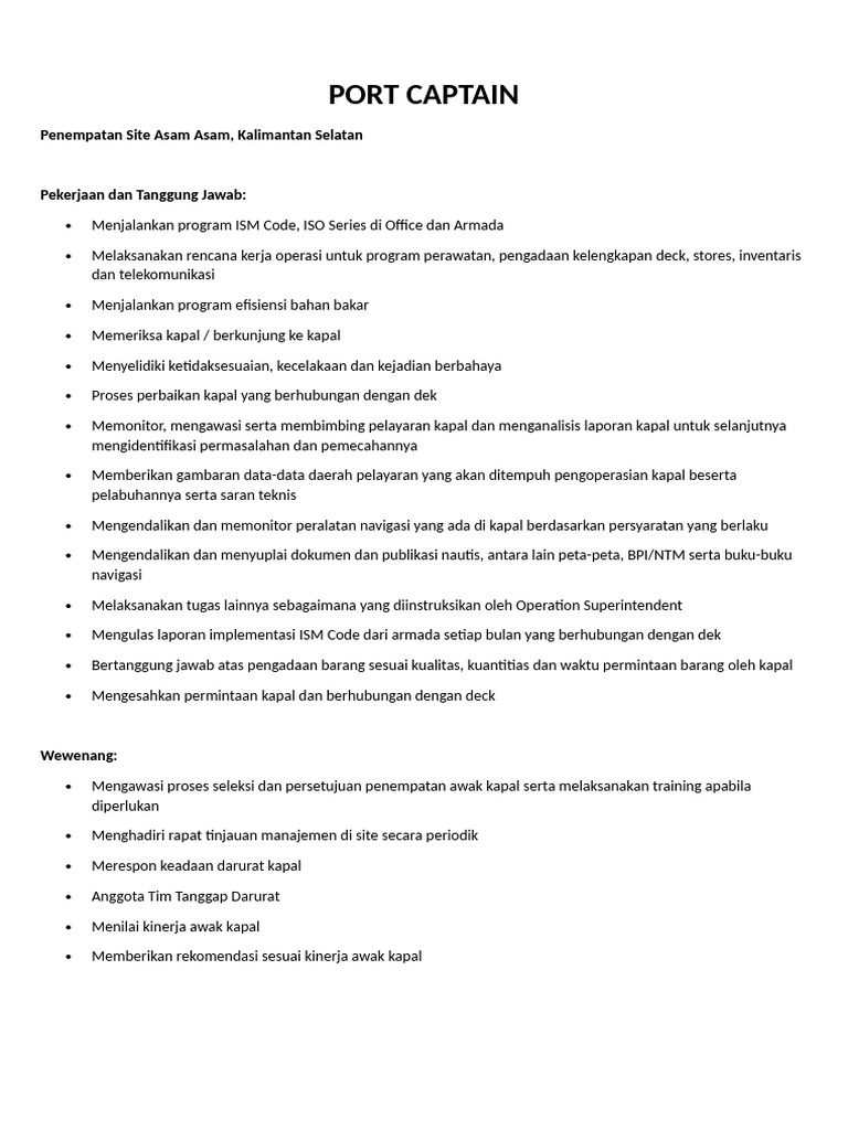 Pengalaman minimal 5 tahun sebagai Port Captain