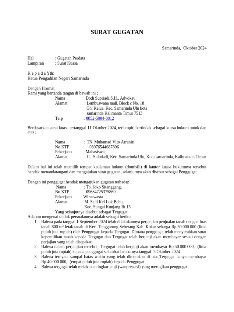 1. Bahwa pada tanggal 1 September 2024 telah dilakukannya perjanjian penjualan tanah dengan luas