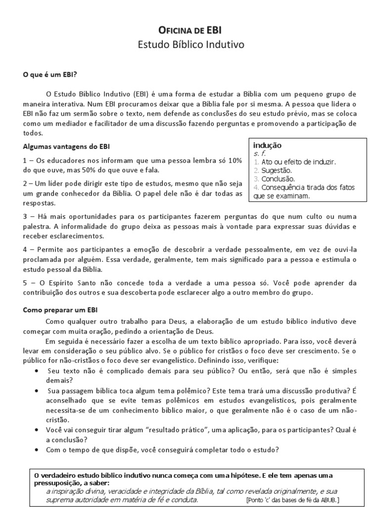 3 H mais oportunidades para os participantes fazerem perguntas do que num culto ou numa palestra. A informalidade do grupo deixa as pessoas mais vontade para expressar suas dvidas e receber esclarecimentos. 4 Permite aos participantes a emoo de descobrir a verdade pessoalmente, em vez de ouvi-la proclamada por algum. Essa verdade, geralmente, tem mais significado para a pessoa e estimula o estudo pessoal da Bblia. 5 O Esprito Santo no concede toda a verdade a uma pessoa s. Voc pode aprender da contribuio dos outros e sua descoberta pode esclarecer algo a outro membro do grupo. Como preparar um EBI Como qualquer outro trabalho para Deus, a elaborao de um estudo bblico indutivo deve comear com muita orao, pedindo a orientao de Deus. Em seguida necessrio fazer a escolha de um texto bblico apropriado. Para isso, voc dever levar em considerao o seu pblico alvo. Se o pblico for cristos o foco deve ser crescimento. Se o pblico for no-cristos o foco deve ser evangelstico. Definindo isso, verifique: Seu texto no complicado demais para seu pblico? Ou ento, ser que no simples demais? Sua passagem bblica toca algum tema polmico? Este tema trar uma discusso produtiva? aconselhado que se evite temas polmicos em estudos evangelsticos, pois geralmente necessita-se de um conhecimento bblico maior, o que geralmente no o caso de um nocristo. Voc vai conseguir tirar algum resultado prtico, uma aplicao, para os participantes? Qual a concluso? Com o tempo de que dispe, voc conseguir completar todo o estudo?