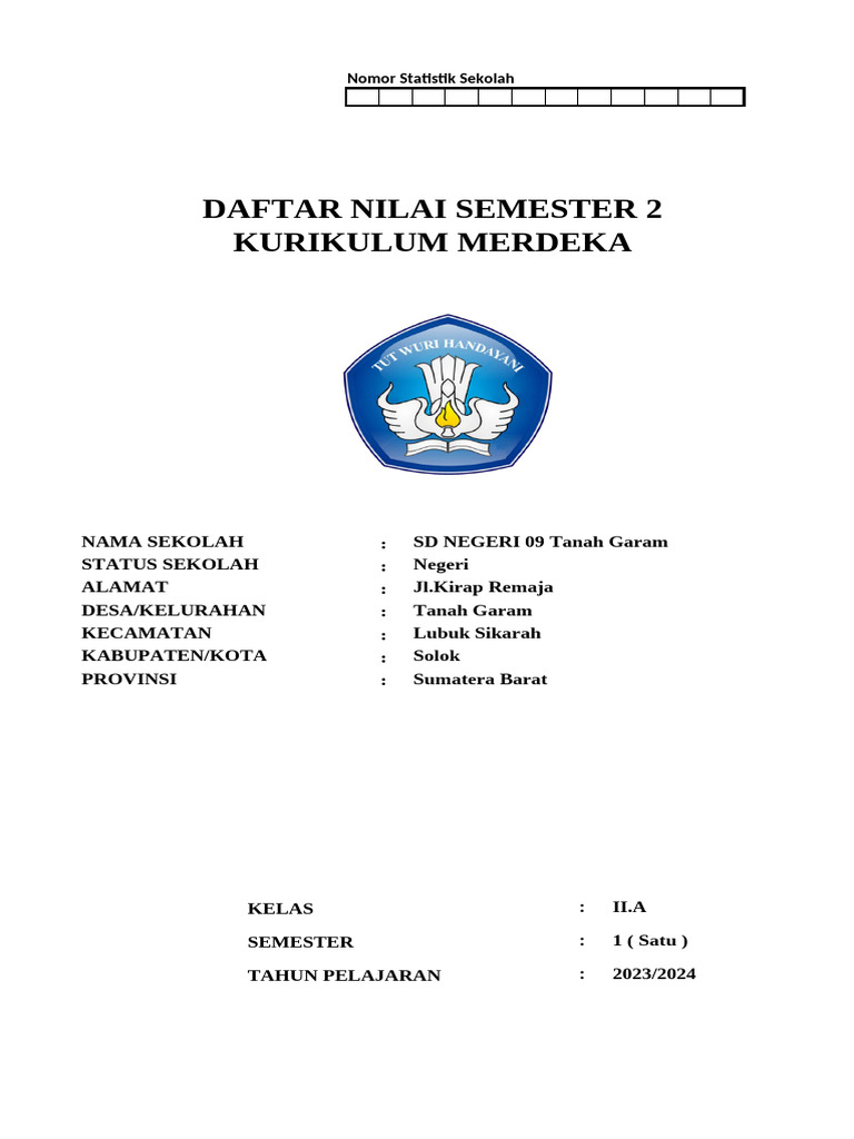 Daftar Nilai Semester 1 SDN 09 Tanah Garam