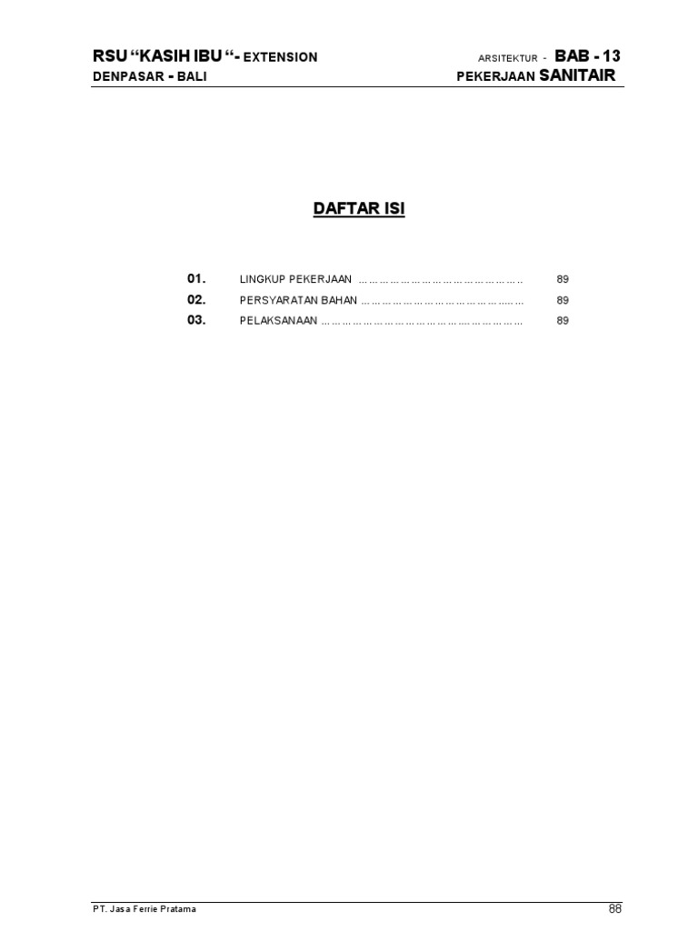 1. Pekerjaan ini meliputi penyediaan tenaga kerja, bahan-bahan, peralatan dan alat-alat bantu lainnya, termasuk pengangkutan yang diperlukan untuk menyelesaikan pekerjaan ini sesuai dengan yang dinyatakan dalam gambar, memenuhi uraian dan syarat-syarat dibawah ini serta memenuhi spesifikasi dan persyaratan dari pabrik pembuatnya. 2. Melaksanakan pekerjaan sanitair hingga diperoleh hasil yang baik dan memuaskan dalam pemakaiannya / operasinya. 3. Pekerjaan pemasangan sanitair ini sesuai dengan yang dinyatakan / ditunjukkan dalam detail gambar, uraian dan syarat-syarat dalam buku ini.