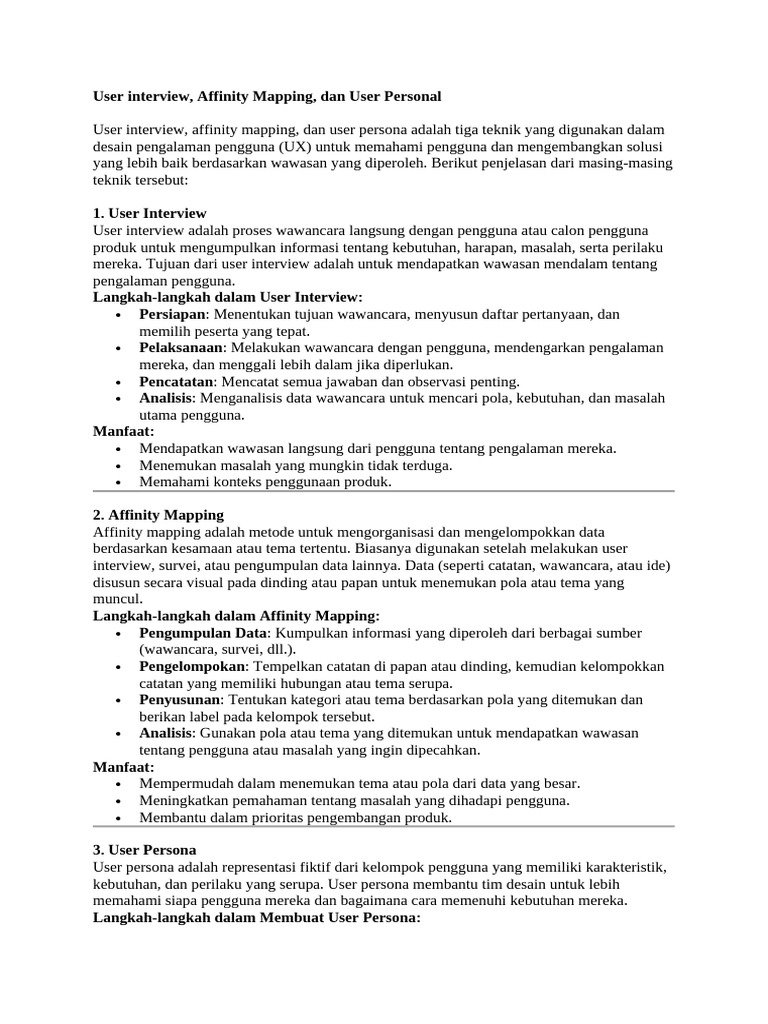 User interview, affinity mapping, dan user persona adalah tiga teknik yang digunakan dalam