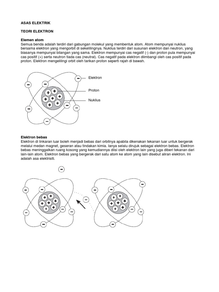atom. Atom mempunyai nuklius bersama elektron yang mengorbit di sekelilingnya. Nuklius terdiri dari susunan elektron dan neutron, yang biasanya mempunyai bilangan yang sama. Elektron mempunyai cas negatif (-) dan proton pula mempunyai cas positif (+) serta neutron tiada cas (neutral). Cas negatif pada elektron diimbangi oleh cas positif pada proton. Elektron mengelilingi orbit oleh tarikan proton seperti rajah di bawah.