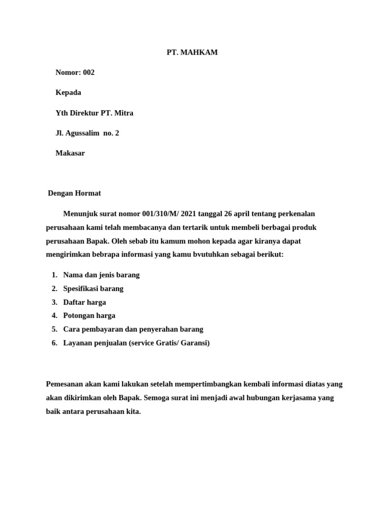 akan dikirimkan oleh Bapak. Semoga surat ini menjadi awal hubungan kerjasama yang