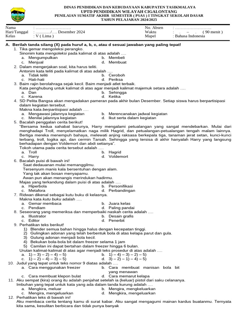 A. Berilah tanda silang (X) pada huruf a, b, c, atau d sesuai jawaban yang paling tepat!