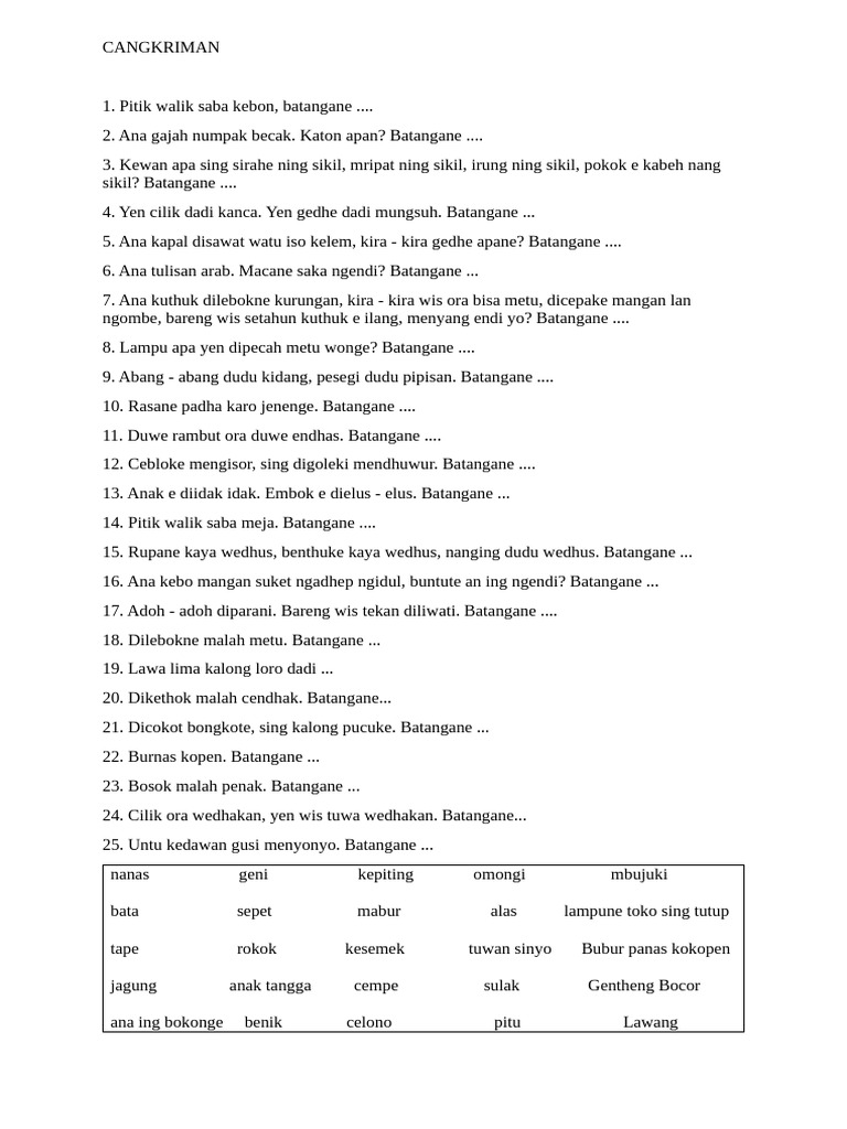 16. Ana kebo mangan suket ngadhep ngidul, buntute an ing ngendi? Batangane ...