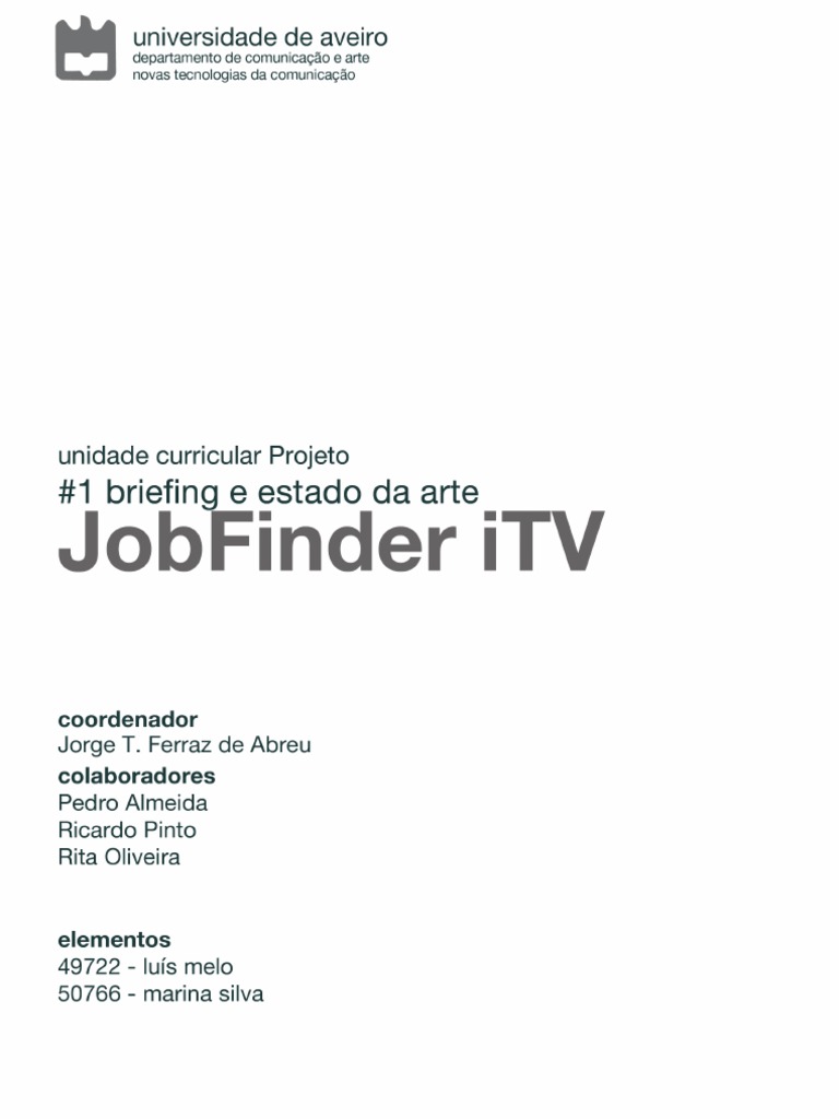 Briefing................................................................................................................................................. 2 1. 2. 3. 4. 5. 6. 7. 8. 9. 10. 11. 12. 1) 2) 3) 4) 5) 6) Objetivos......................................................................................................................... 2 Ideia central .................................................................................................................. 2 Mensagens-chave ........................................................................................................ 3 Viso ................................................................................................................................ 3 Misso ............................................................................................................................. 3 Valores ............................................................................................................................ 3 Cultura, personalidade e estilo ............................................................................... 4 Valor do Servio ........................................................................................................... 4 Pblico-alvo .................................................................................................................. 4 Stakeholders ................................................................................................................. 4 Valores centrais (anlise SWOT do JobFinder iTV) ......................................... 5 Vantagens/estratgias competitivas ................................................................... 5 Aplicaes de Jobsearching...................................................................................... 7 Projetos relacionados com Social TV e agregao de contedo ...............11 Contedo ......................................................................................................................17 Pesquisa ao nvel de solues tcnicas ...............................................................20 Pesquisa ao nvel de solues grficas ...............................................................23 Outras referncias em termos de grafismos e contedo ..............................26