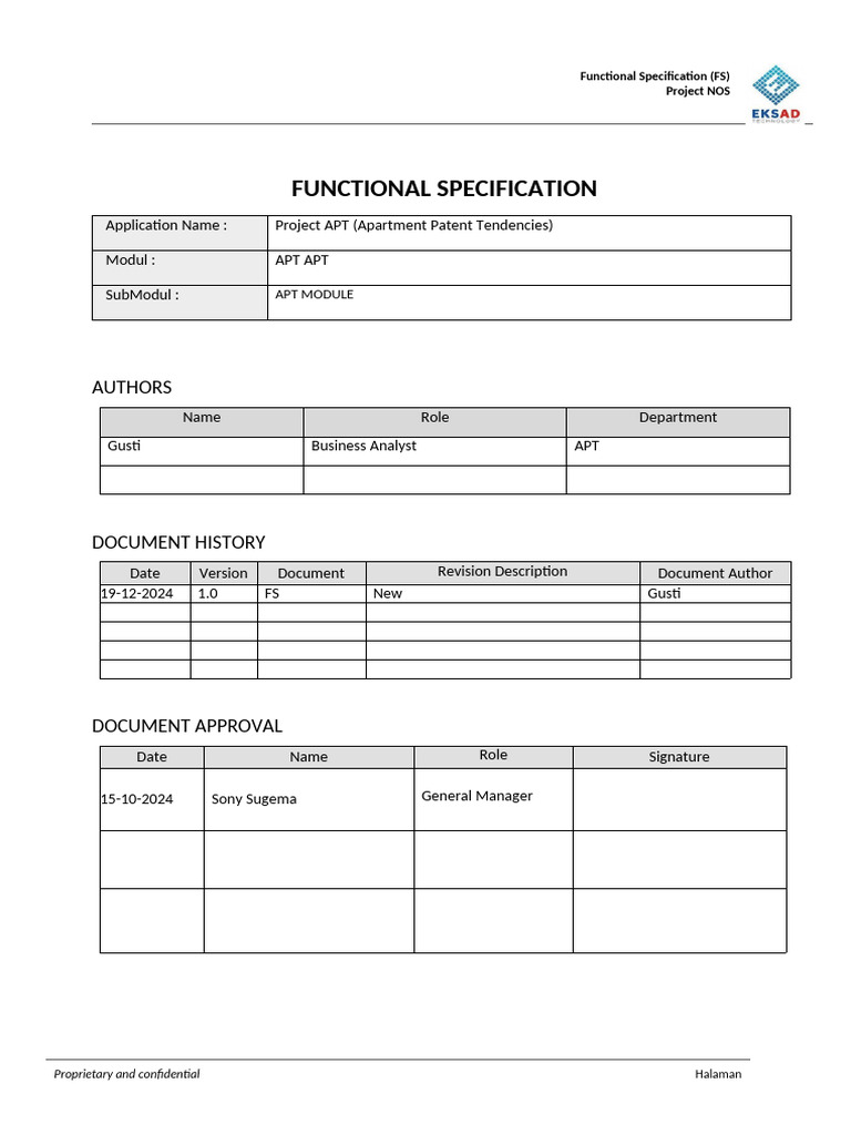 Berisi judul modul & submodul FSD, Authors (penyusun dokumen), tabel versi dokumen (versi dokumen naik
