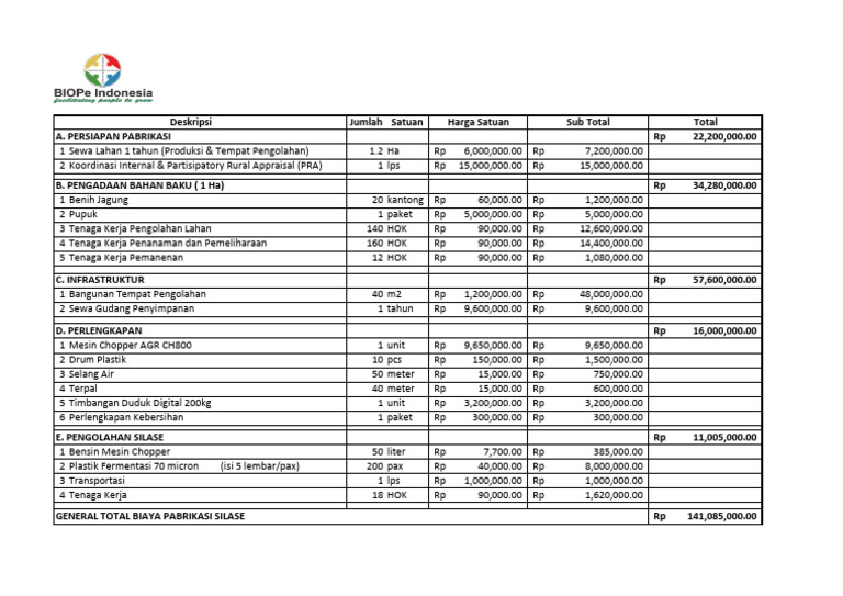 GENERAL TOTAL BIAYA PABRIKASI SILASE Rp 141,085,000.00