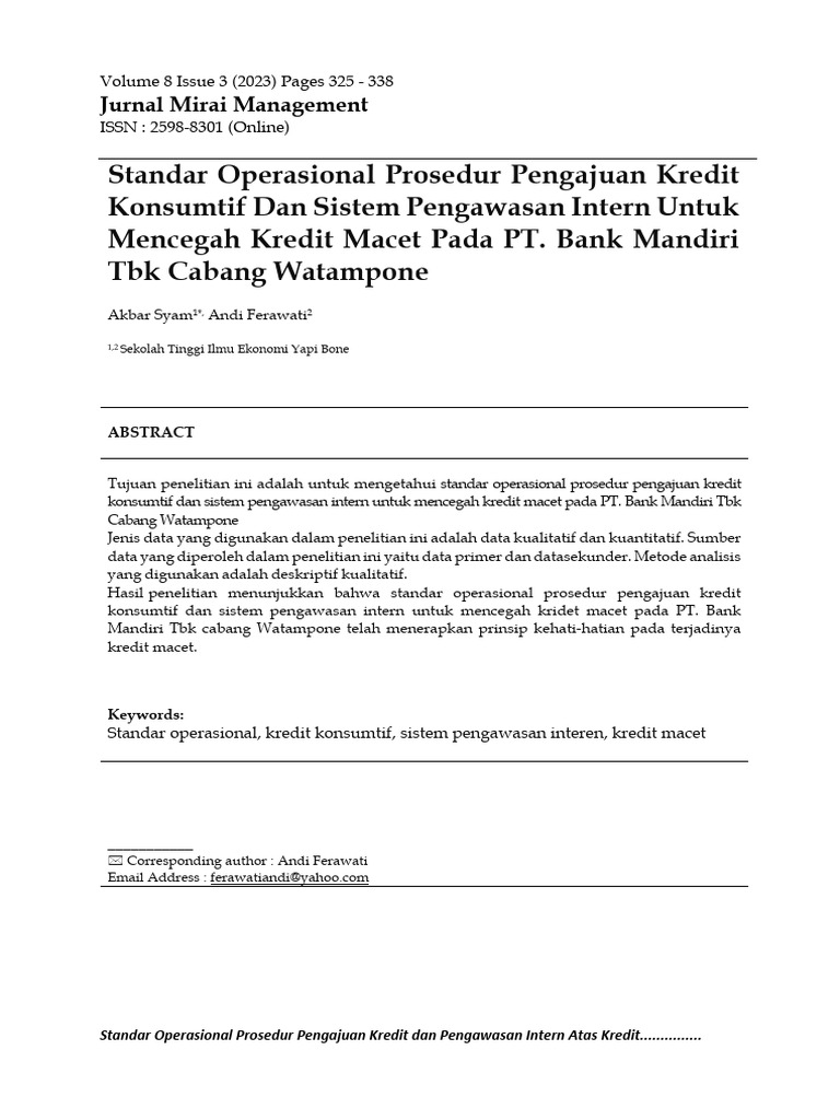 Standar operasional, kredit konsumtif, sistem pengawasan interen, kredit macet