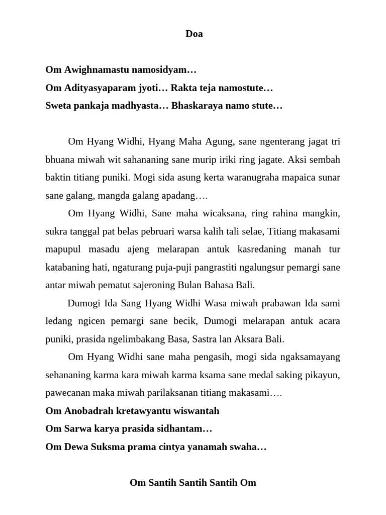 Om Hyang Widhi, Hyang Maha Agung, sane ngenterang jagat tri