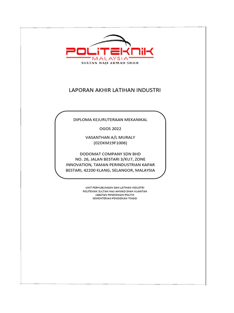 Setelah menjalani program Latihan Industri di Dodomat company, saya didapati terdapat