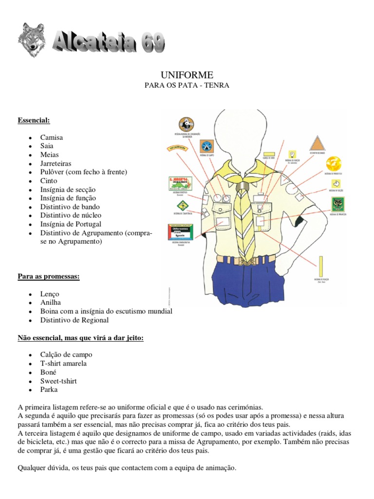 A primeira listagem refere-se ao uniforme oficial e que o usado nas cerimnias. A segunda aquilo que precisars para fazer as promessas (s os podes usar aps a promessa) e nessa altura passar tambm a ser essencial, mas no precisas comprar j, fica ao critrio dos teus pais. A terceira listagem aquilo que designamos de uniforme de campo, usado em variadas actividades (raids, idas de bicicleta, etc.) mas que no o correcto para a missa de Agrupamento, por exemplo. Tambm no precisas de comprar j, uma gesto que ficar ao critrio dos teus pais. Qualquer dvida, os teus pais que contactem com a equipa de animao.