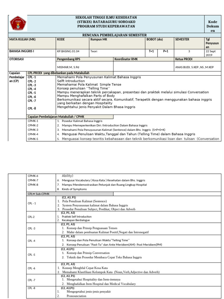 BAHASA INGGRIS I KP.BASING.01.04 Teori T=1 P=1 3 22 Sept