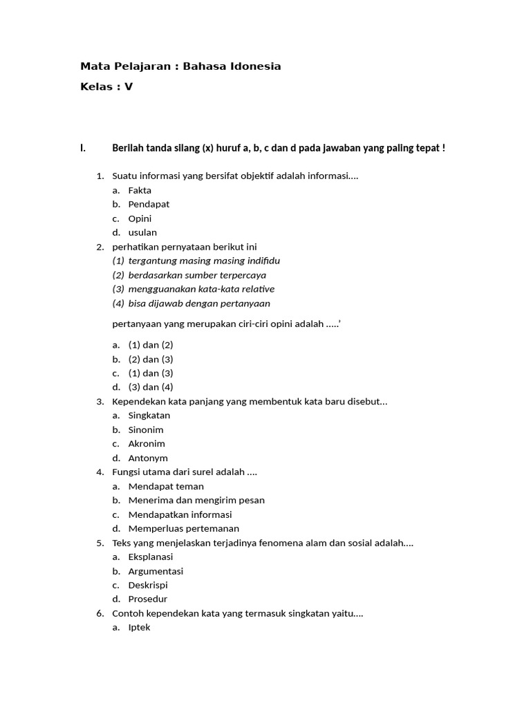 I. Berilah tanda silang (x) huruf a, b, c dan d pada jawaban yang paling tepat !