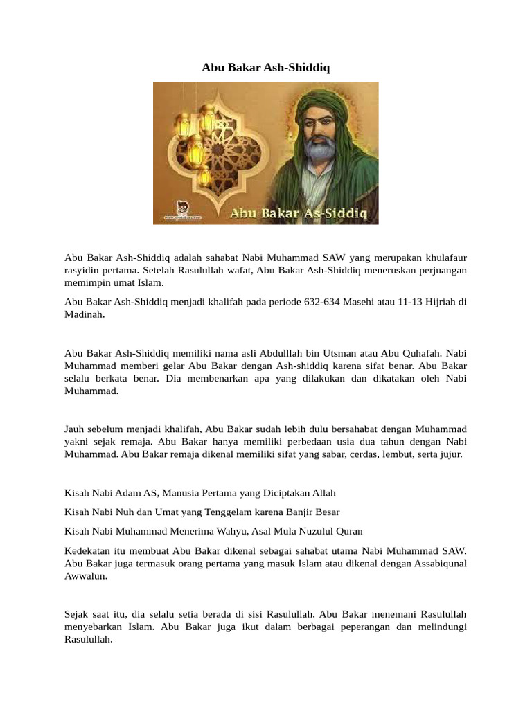 Muhammad. Abu Bakar remaja dikenal memiliki sifat yang sabar, cerdas, lembut, serta jujur.