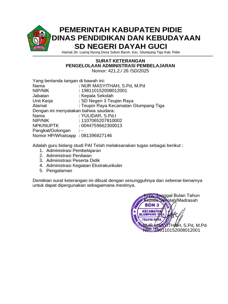Alamat : Teupin Raya Kecamatan Glumpang Tiga