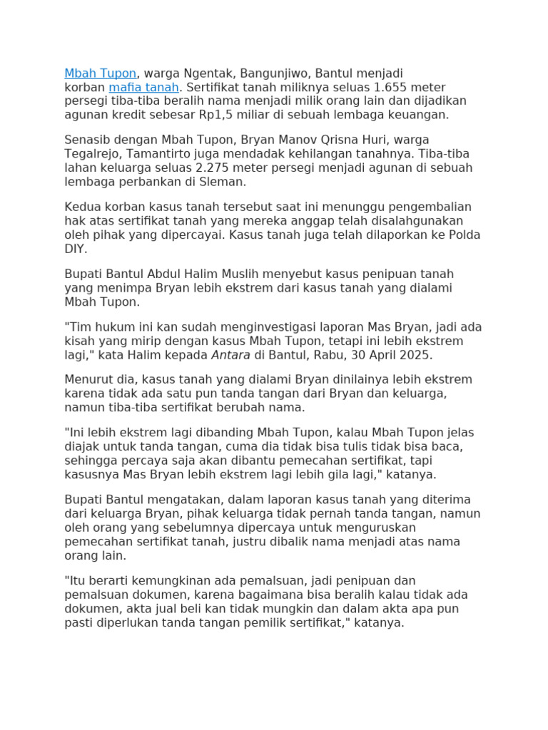 penggelapan sertifikat tanah di wilayah Kasihan, seperti dialami