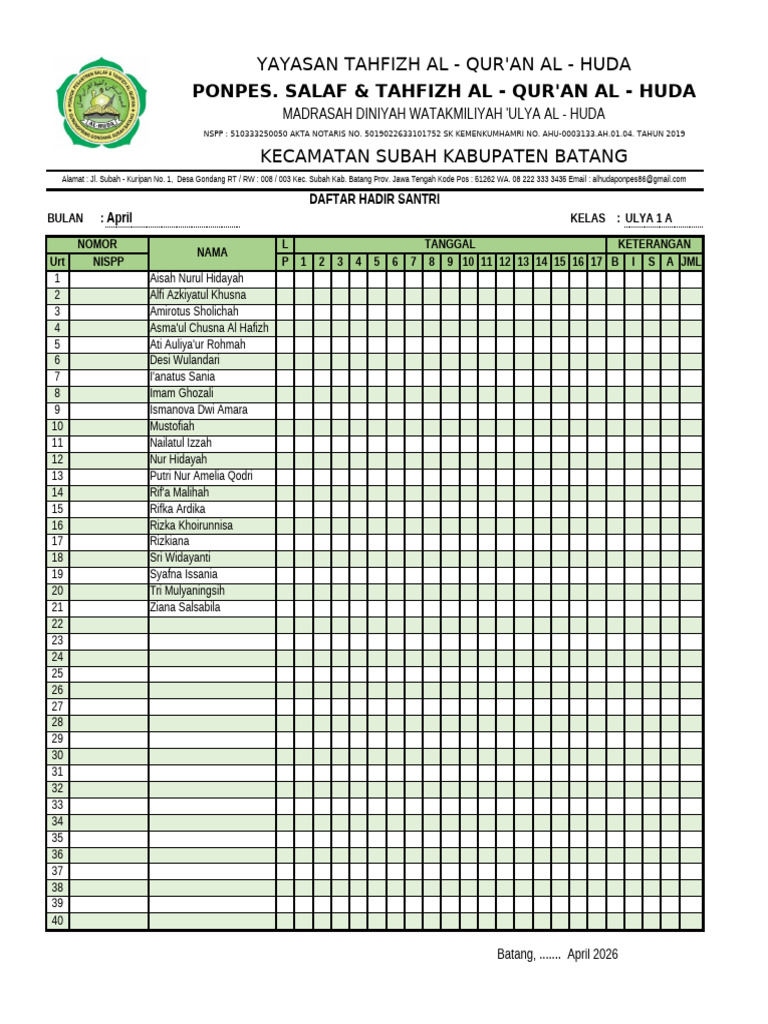 Alamat : Jl. Subah - Kuripan No. 1, Desa Gondang RT / RW : 008 / 003 Kec. Subah Kab. Batang Prov. Jawa Tengah Kode Pos : 51262 WA. 08 222 333 3435 Email : alhudaponpes86@gmail.com