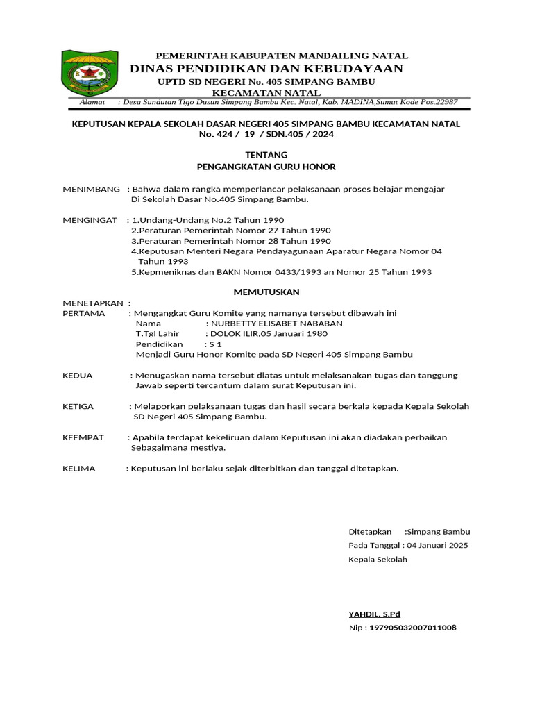 KEPUTUSAN KEPALA SEKOLAH DASAR NEGERI 405 SIMPANG BAMBU KECAMATAN NATAL