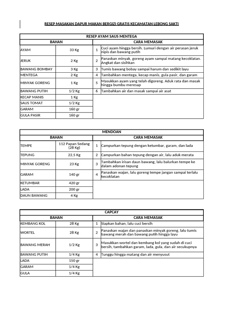 RESEP MASAKAN DAPUR MAKAN BERGIZI GRATIS KECAMATAN LEBONG SAKTI