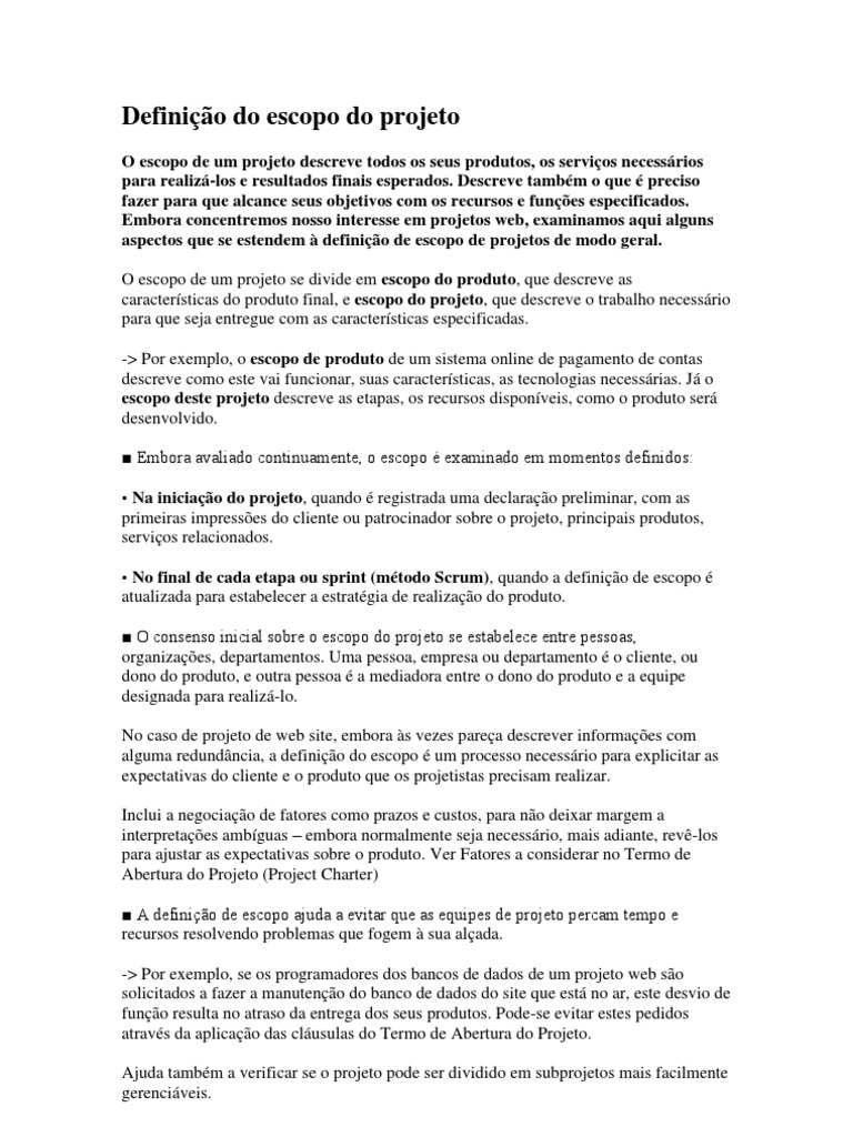 O escopo de um projeto descreve todos os seus produtos, os servios necessrios para realiz-los e resultados finais esperados. Descreve tambm o que preciso fazer para que alcance seus objetivos com os recursos e funes especificados. Embora concentremos nosso interesse em projetos web, examinamos aqui alguns aspectos que se estendem definio de escopo de projetos de modo geral. O escopo de um projeto se divide em escopo do produto, que descreve as caractersticas do produto final, e escopo do projeto, que descreve o trabalho necessrio para que seja entregue com as caractersticas especificadas. -> Por exemplo, o escopo de produto de um sistema online de pagamento de contas descreve como este vai funcionar, suas caractersticas, as tecnologias necessrias. J o escopo deste projeto descreve as etapas, os recursos disponveis, como o produto ser desenvolvido. Embora avaliado continuamente, o escopo examinado em momentos definidos: Na iniciao do projeto, quando registrada uma declarao preliminar, com as primeiras impresses do cliente ou patrocinador sobre o projeto, principais produtos, servios relacionados. No final de cada etapa ou sprint (mtodo Scrum), quando a definio de escopo atualizada para estabelecer a estratgia de realizao do produto. O consenso inicial sobre o escopo do projeto se estabelece entre pessoas, organizaes, departamentos. Uma pessoa, empresa ou departamento o cliente, ou dono do produto, e outra pessoa a mediadora entre o dono do produto e a equipe designada para realiz-lo. No caso de projeto de web site, embora s vezes parea descrever informaes com alguma redundncia, a definio do escopo um processo necessrio para explicitar as expectativas do cliente e o produto que os projetistas precisam realizar. Inclui a negociao de fatores como prazos e custos, para no deixar margem a interpretaes ambguas embora normalmente seja necessrio, mais adiante, rev-los para ajustar as expectativas sobre o produto. Ver Fatores a considerar no Termo de Abertura do Projeto (Project Charter) A definio de escopo ajuda a evitar que as equipes de projeto percam tempo e recursos resolvendo problemas que fogem sua alada. -> Por exemplo, se os programadores dos bancos de dados de um projeto web so solicitados a fazer a manuteno do banco de dados do site que est no ar, este desvio de funo resulta no atraso da entrega dos seus produtos. Pode-se evitar estes pedidos atravs da aplicao das clusulas do Termo de Abertura do Projeto. Ajuda tambm a verificar se o projeto pode ser dividido em subprojetos mais facilmente gerenciveis.