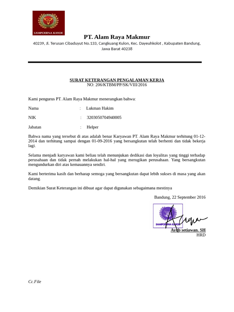Bahwa nama yang tersebut di atas adalah benar Karyawan PT. Alam Raya Makmur terhitung 01-12-