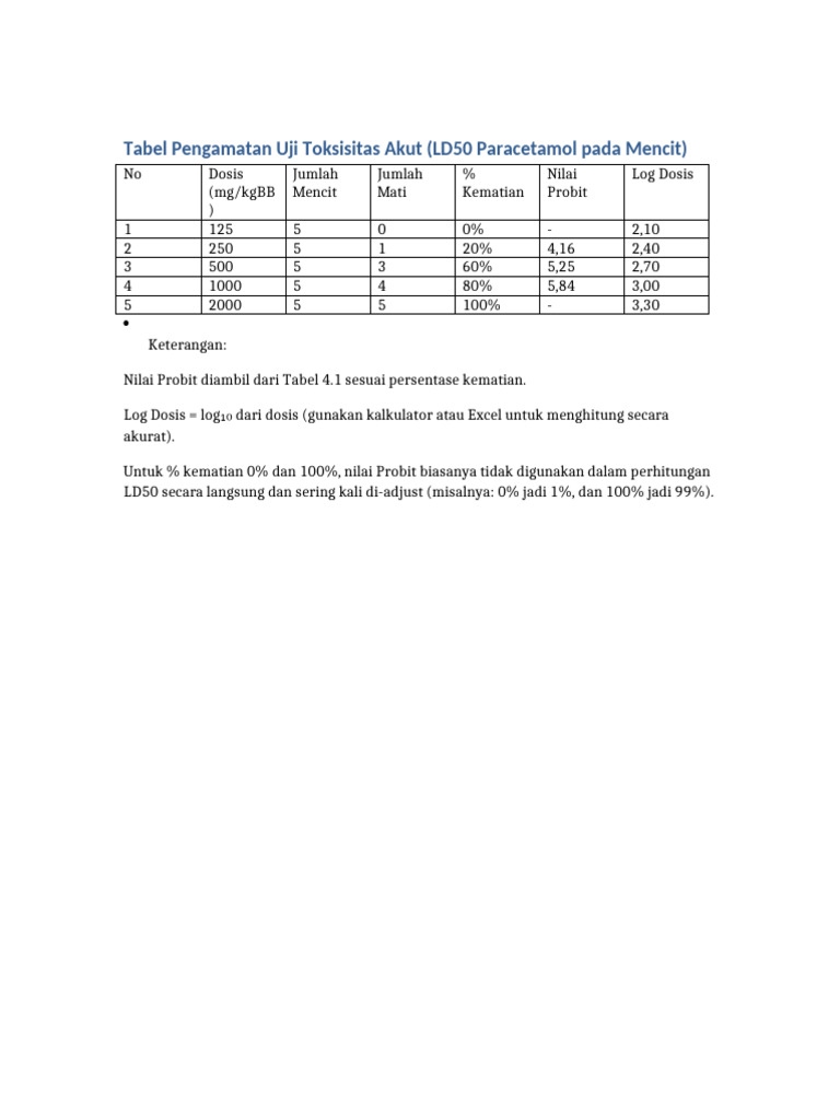 Tabel Pengamatan Uji Toksisitas Akut (LD50 Paracetamol pada Mencit)