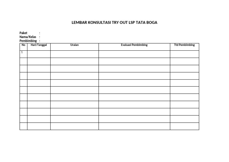 Dokumen ini adalah lembar konsultasi untuk try out LSP Tata Boga. Terdapat kolom untuk mencatat nama, kelas, pembimbing, serta evaluasi dan tanda tangan pembimbing. Format ini digunakan untuk mencatat kegiatan dan penilaian selama try out.
