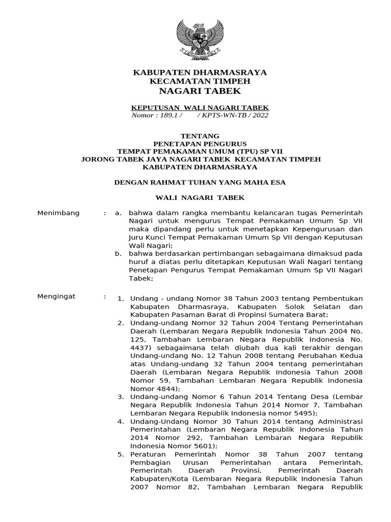 Tentang : Penetapan Pengurus Tempat Pemakaman Umum Sp VII Nagari Tabek