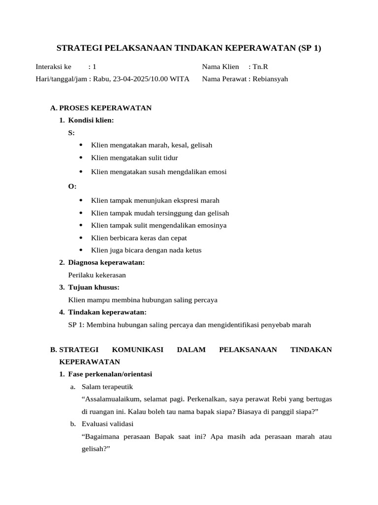 STRATEGI PELAKSANAAN TINDAKAN KEPERAWATAN (SP 1)