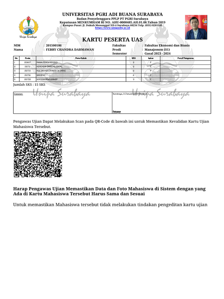 Harap Pengawas Ujian Memastikan Data dan Foto Mahasiswa di Sistem dengan yang