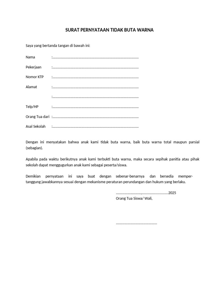 SURAT PERNYATAAN TIDAK BUTA WARNA