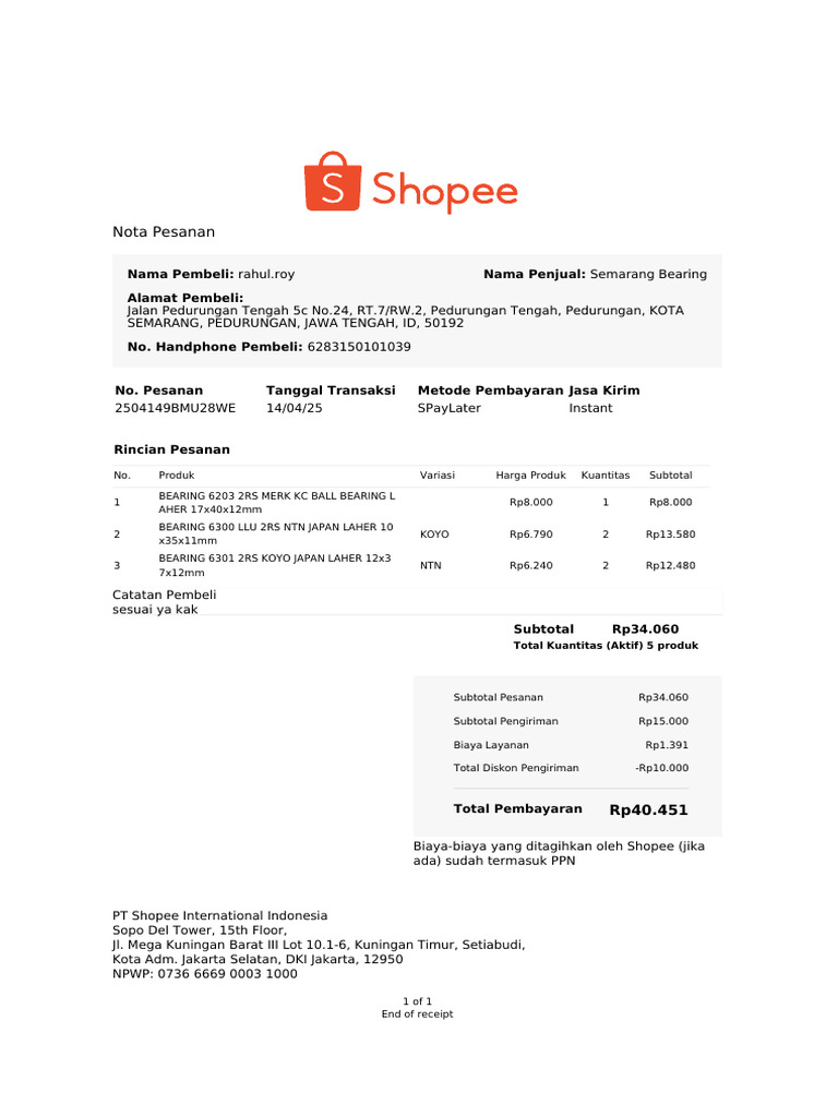 Nama Pembeli: rahul.roy Nama Penjual: Semarang Bearing