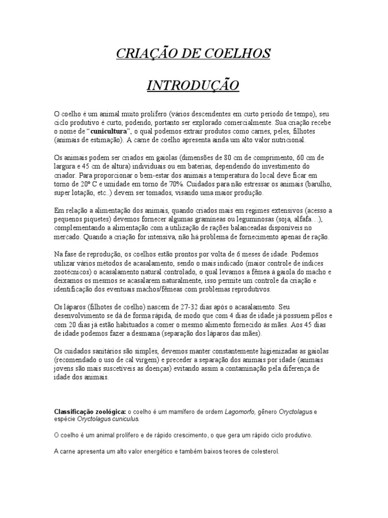 Classificao zoolgica: o coelho um mamfero de ordem Lagomorfo, gnero Oryctolagus e espcie Oryctolagus cuniculus. O coelho um animal prolfero e de rpido crescimento, o que gera um rpido ciclo produtivo. A carne apresenta um alto valor energtico e tambm baixos teores de colesterol.