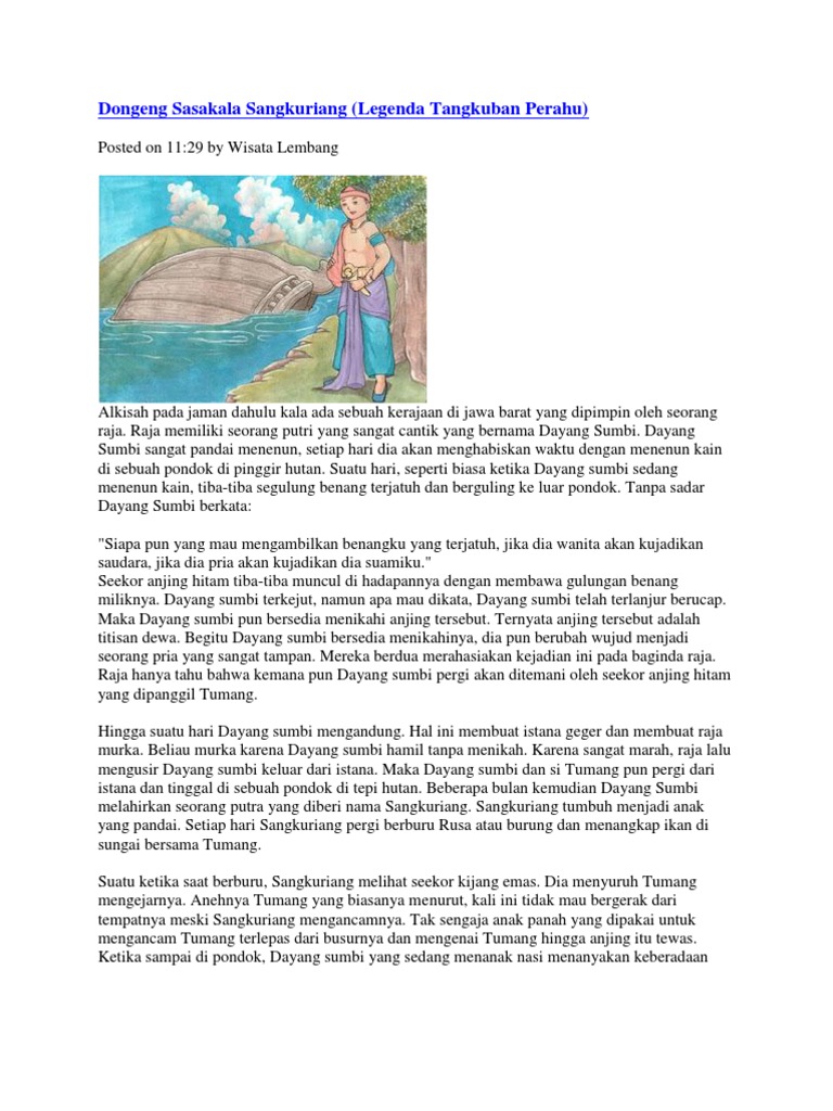 Alkisah pada jaman dahulu kala ada sebuah kerajaan di jawa barat yang dipimpin oleh seorang raja. Raja memiliki seorang putri yang sangat cantik yang bernama Dayang Sumbi. Dayang Sumbi sangat pandai menenun, setiap hari dia akan menghabiskan waktu dengan menenun kain di sebuah pondok di pinggir hutan. Suatu hari, seperti biasa ketika Dayang sumbi sedang menenun kain, tiba-tiba segulung benang terjatuh dan berguling ke luar pondok. Tanpa sadar Dayang Sumbi berkata: "Siapa pun yang mau mengambilkan benangku yang terjatuh, jika dia wanita akan kujadikan saudara, jika dia pria akan kujadikan dia suamiku." Seekor anjing hitam tiba-tiba muncul di hadapannya dengan membawa gulungan benang miliknya. Dayang sumbi terkejut, namun apa mau dikata, Dayang sumbi telah terlanjur berucap. Maka Dayang sumbi pun bersedia menikahi anjing tersebut. Ternyata anjing tersebut adalah titisan dewa. Begitu Dayang sumbi bersedia menikahinya, dia pun berubah wujud menjadi seorang pria yang sangat tampan. Mereka berdua merahasiakan kejadian ini pada baginda raja. Raja hanya tahu bahwa kemana pun Dayang sumbi pergi akan ditemani oleh seekor anjing hitam yang dipanggil Tumang. Hingga suatu hari Dayang sumbi mengandung. Hal ini membuat istana geger dan membuat raja murka. Beliau murka karena Dayang sumbi hamil tanpa menikah. Karena sangat marah, raja lalu mengusir Dayang sumbi keluar dari istana. Maka Dayang sumbi dan si Tumang pun pergi dari istana dan tinggal di sebuah pondok di tepi hutan. Beberapa bulan kemudian Dayang Sumbi melahirkan seorang putra yang diberi nama Sangkuriang. Sangkuriang tumbuh menjadi anak yang pandai. Setiap hari Sangkuriang pergi berburu Rusa atau burung dan menangkap ikan di sungai bersama Tumang. Suatu ketika saat berburu, Sangkuriang melihat seekor kijang emas. Dia menyuruh Tumang mengejarnya. Anehnya Tumang yang biasanya menurut, kali ini tidak mau bergerak dari tempatnya meski Sangkuriang mengancamnya. Tak sengaja anak panah yang dipakai untuk mengancam Tumang terlepas dari busurnya dan mengenai Tumang hingga anjing itu tewas. Ketika sampai di pondok, Dayang sumbi yang sedang menanak nasi menanyakan keberadaan